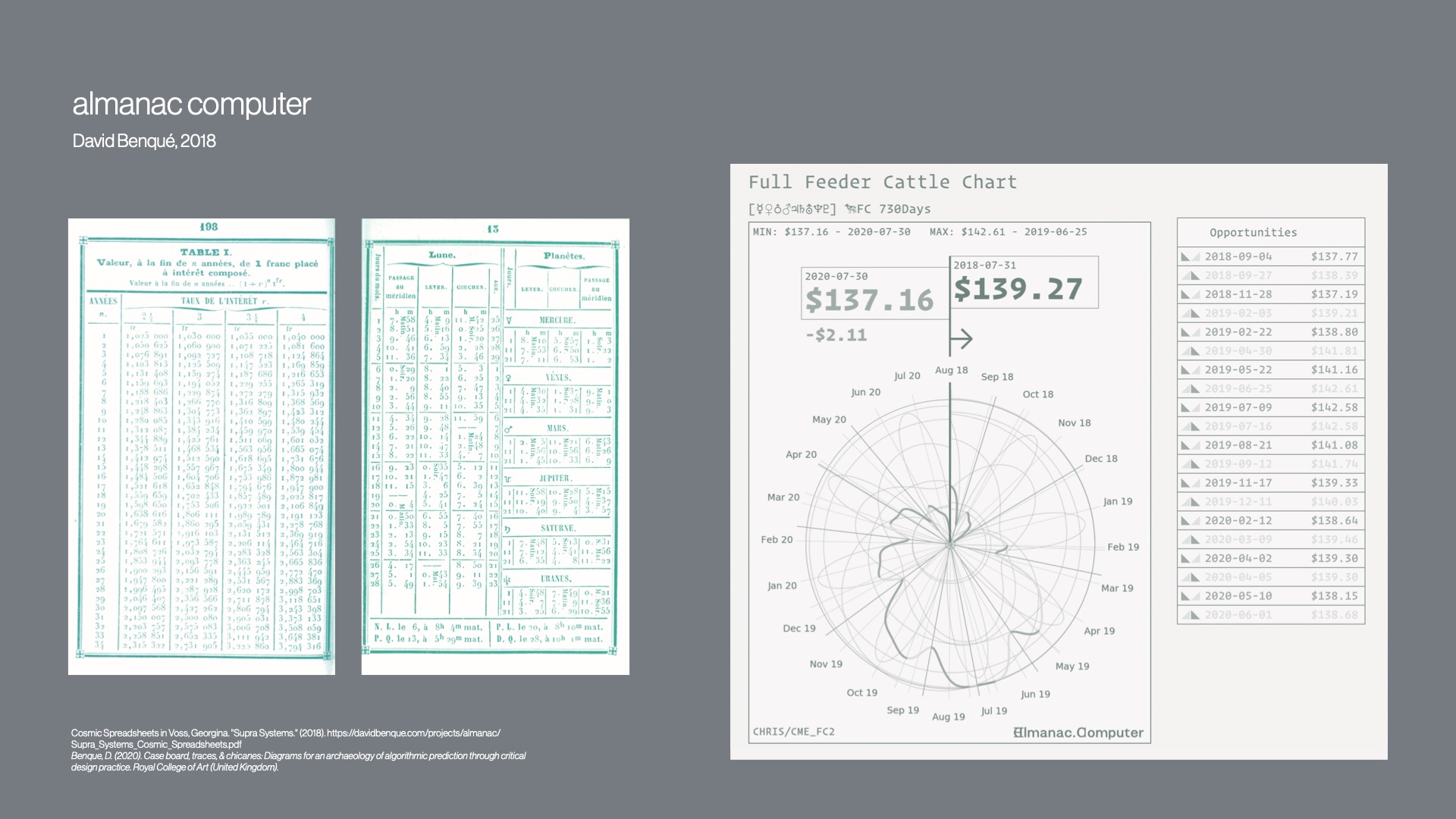 For example, David Benqué’s draws on and revisits the cosmic spreadsheets of the Old Farmer’s Almanac (1792) as a way to explore and examine the ‘imaginary of data and prediction.’ Drawing from these forms and their logics and their aesthetics, Benqué applies them to “contemporary tools used in data science and machine learning to implement divinatory rationalities”